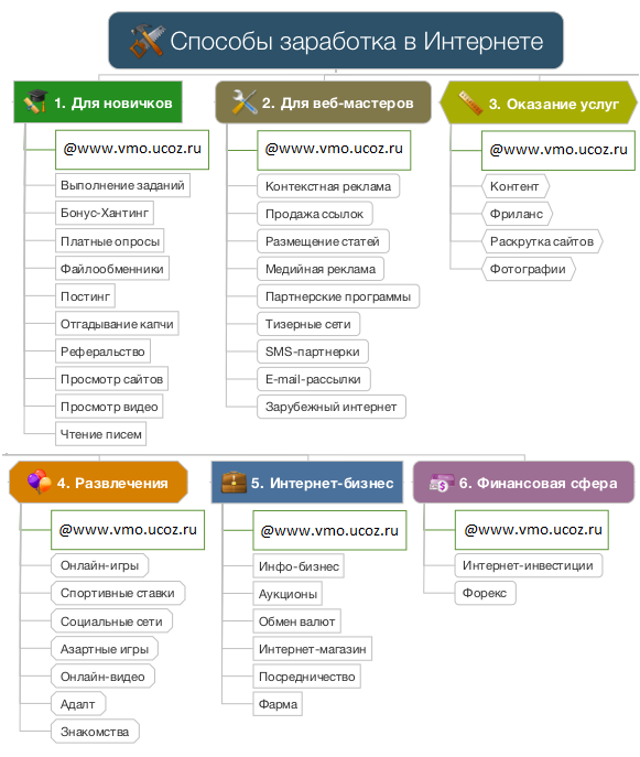 Перед тем как начать, внимательно рассмотрите интеллект-карту “Методы заработка в Интернете” и сохраните ее к себе на компьютер. Все виды заработка в Интернете изображены на этой картинке и разбиты на 6 групп:
